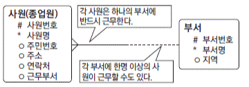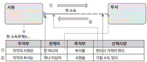 -하나 또는 두 개의 엔터티에서 인스턴스를 연관시키는 업무적인 이유. 관계도 집합