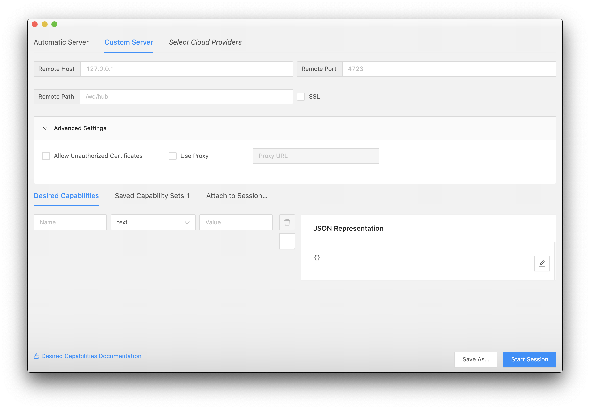이제 Start Session 버튼을 클릭한다. 이 작업은 시간이 조금 소요된다. 작업로그는 Appium 앱에서 확인할 수 있다.