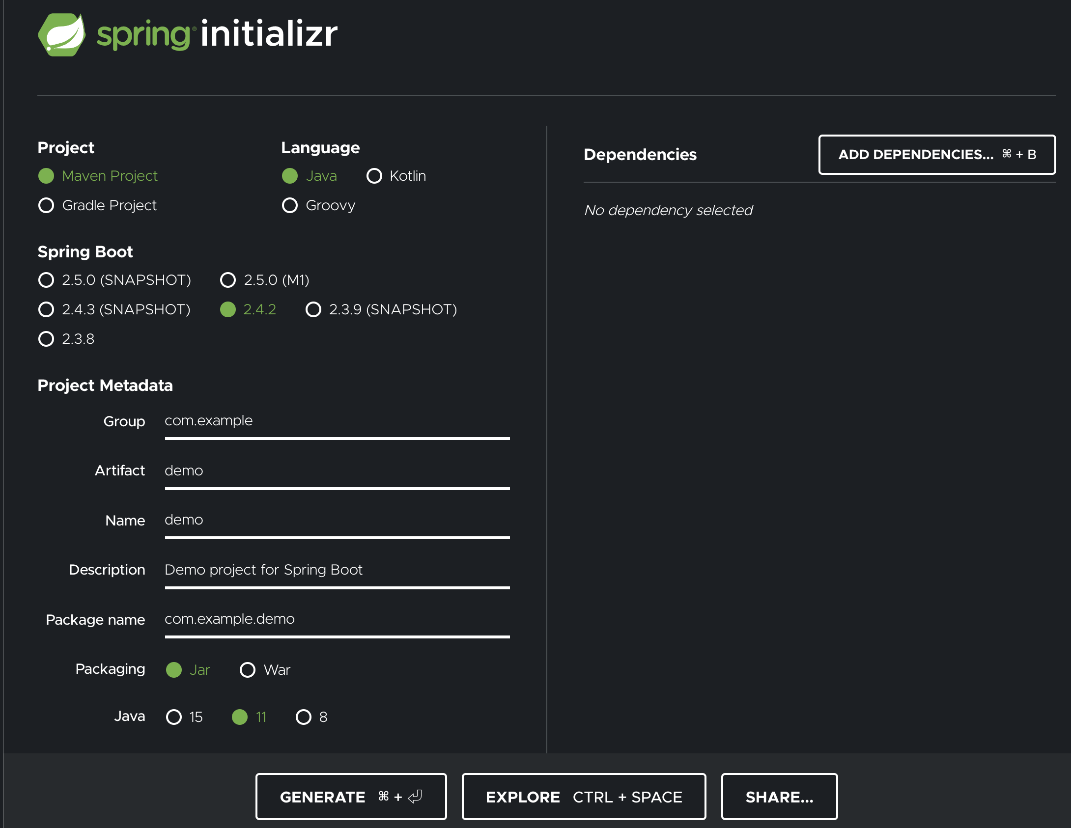 위와 같은 화면이 나오는데 왼쪽은 프로젝트 정보를 작성하는 영역이고, 오른쪽은 프로젝트 디펜던시를 추가하는 부분이다.