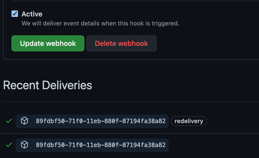 Update webhook 버튼을 클릭하면 Jenkins로 webhook을 전달한다. 그러면 Jenkins에서 빌드를 수행할 것이다.